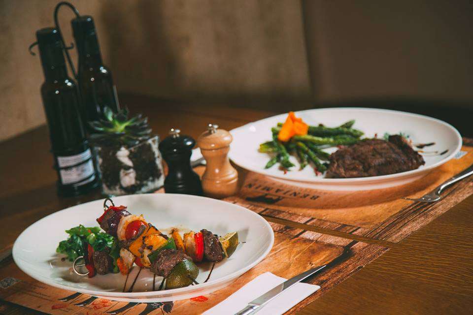 Denumirea spune tot – vorbim de un steakhouse, probabil cel mai bun din Sibiu. Benjamin Steakhouse e un restaurant cu specific american, ceea ce înseamnă că se pune mare accent pe fripturile de calitate. Folosesc legendara carne de vită Black Angus, maturată minim 21 de zile, provenite din vite crescute pe pășunile naturale din Transilvania. Și o prepară la un cuptor-grill Josper, cu cărbune de lemn (unic în Transilvania, după cum zic ei), care oferă o savoare deosebită fiecărui preparat. Avantajul acestui cuptor e că se poate găti repede, la 400 de grade, așa încât carnea capătă o aromă excelentă afumată, suculentă. Pe lângă steak-uri, au și salate, pește, paste, burgeri și deserturi delicioase. Preparate simple, dar foarte gustoase, ingrediente de calitate, gătite la perfecțiune, mâncare plină de aromă.