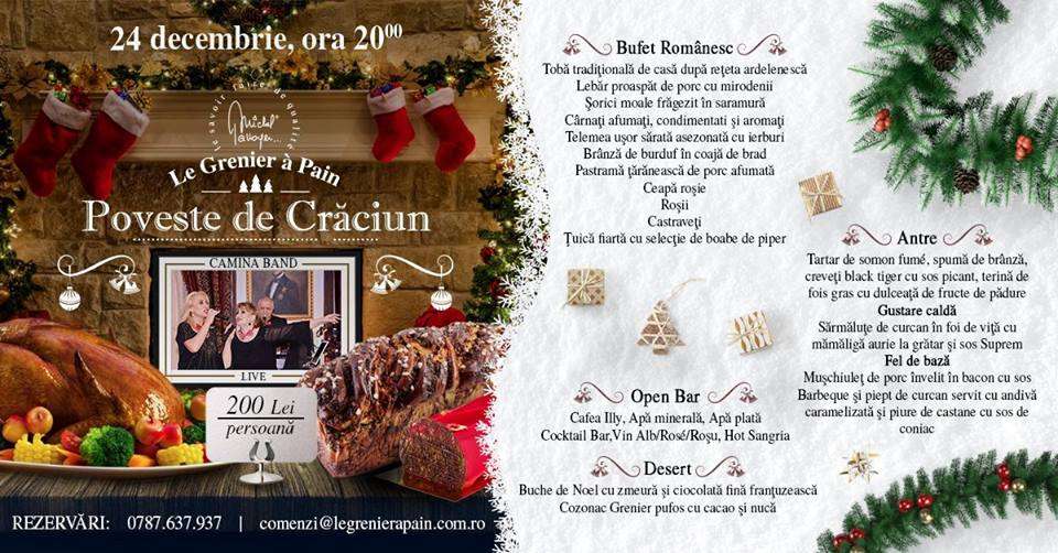 La brutaria-restaurant de pe Nicolae Carmafil Le Grenier a Pain va asteapta un meniu special, live music si alte surprize. Evenimentul se numeste Poveste de Craciun, meniul costa 200 de lei/ persoana in care vaeit incluse mai multe mancaurir, dar si bauturi si desert.