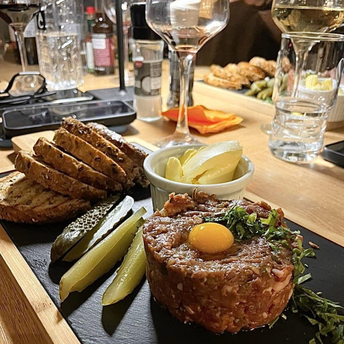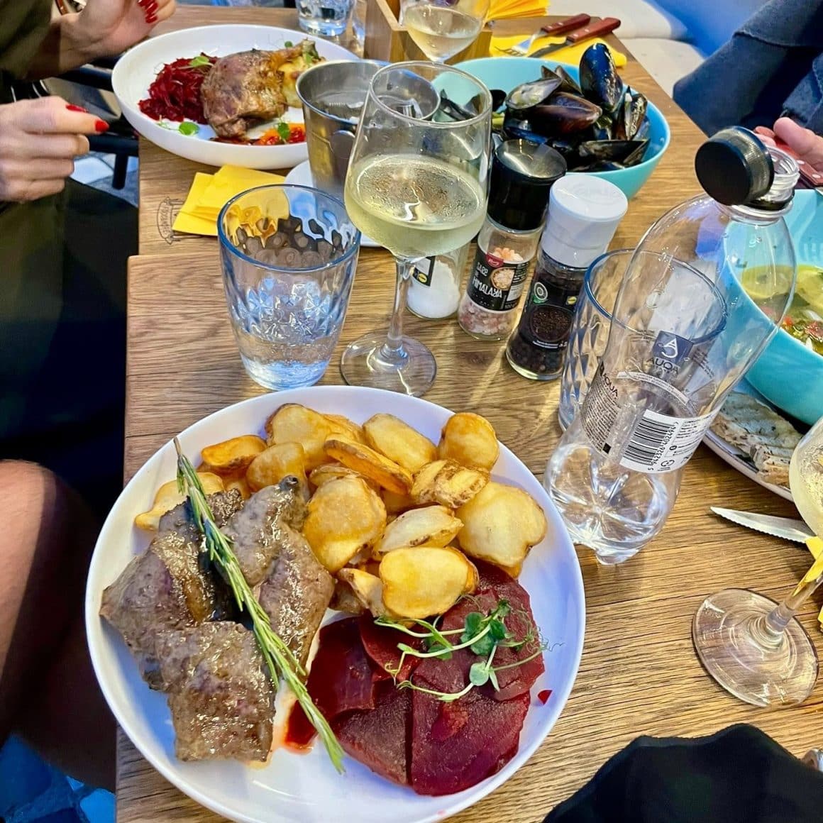 Ce găsești în farfurie merge pe aceeași linie: ingrediente bune, preparate fără artificii inutile. Carnea ajunge pe grătarul Josper, pastele sunt făcute în casă, iar bucătăria jonglează între preparate clasice și interpretări moderne. Poți porni de la un tartar sau carpacciode vită, apoi să continui cu un steak bine rumenit, un piept de rață sau chiar fructe de mare gătite simplu și corect. Nouă ne-a plăcut mult și ciorba de pește mediternaneană.