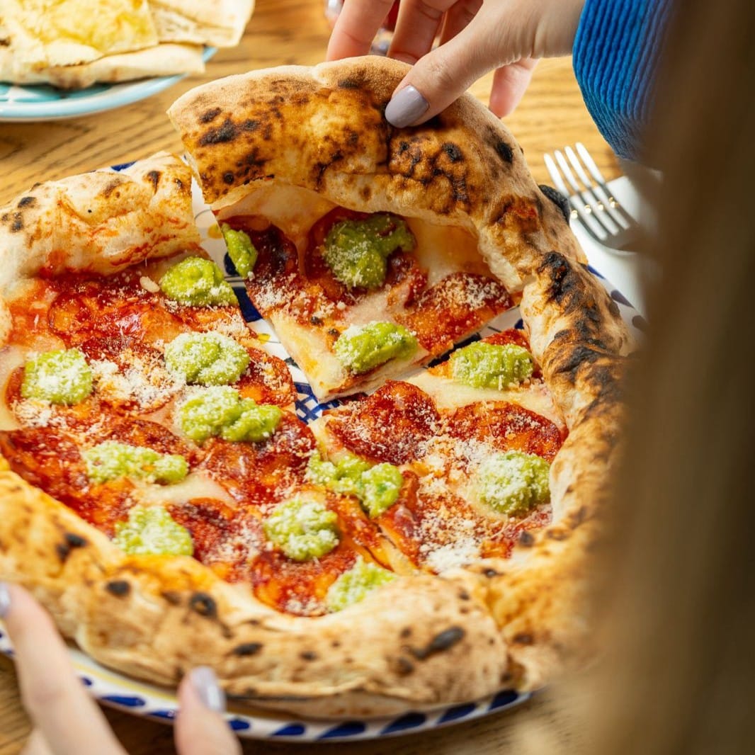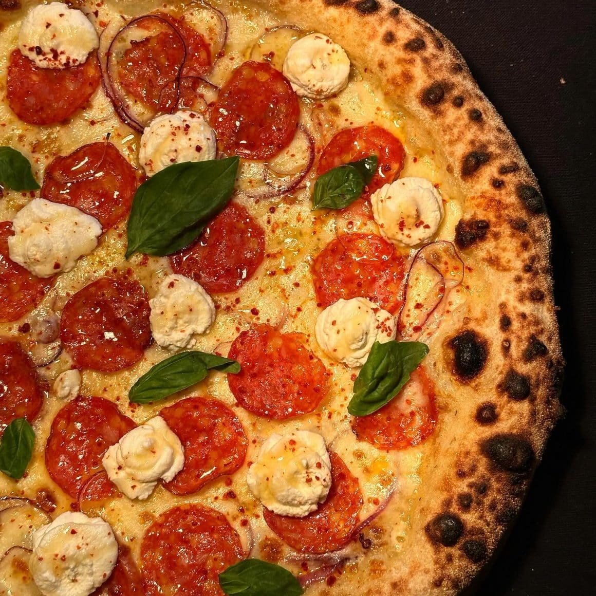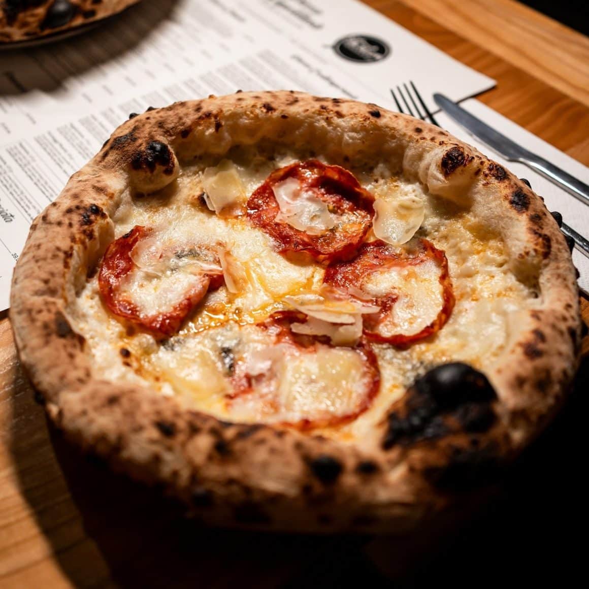 close up cu pizza Diavola cu salam bine rumenti de la Osteria Zucca