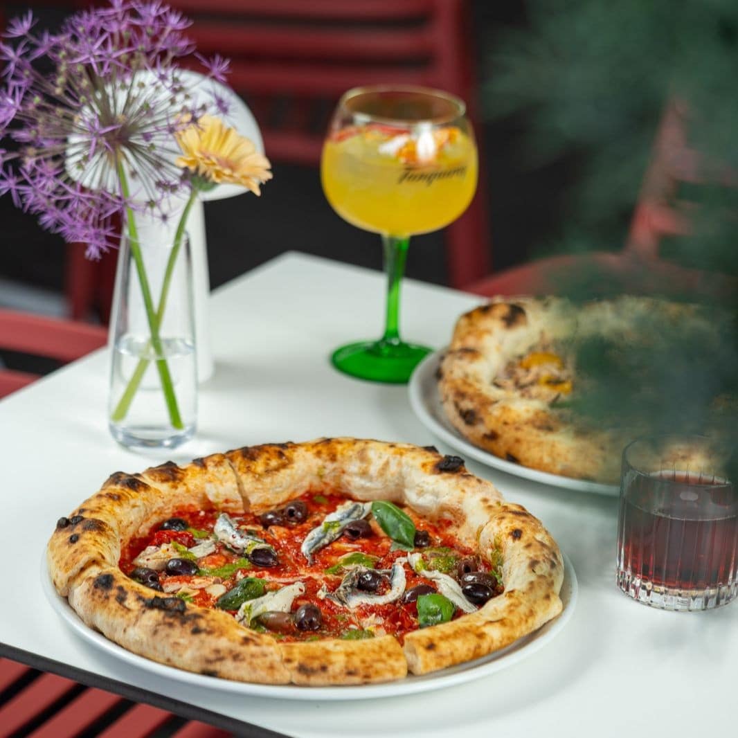 Restaurantul în sine arată foarte bine, la fel și terasa, iar meniul are o mulțime de opțiuni din bucătăria italiană. Iar pizza e delicioasă, împărțită în mai multe categorii: cu bază de mozzarella și fior di latte, cu bază de mozzarella di buffala, pizza gourmet sau… pinsa. Pinsa e tot un fel de pizza, dar ovală și cu blatul făcut dintr-un amestec de făină (pe lângă cea din grâu se poate folosi făină din grâu spelt, soia sau chiar din orez.)