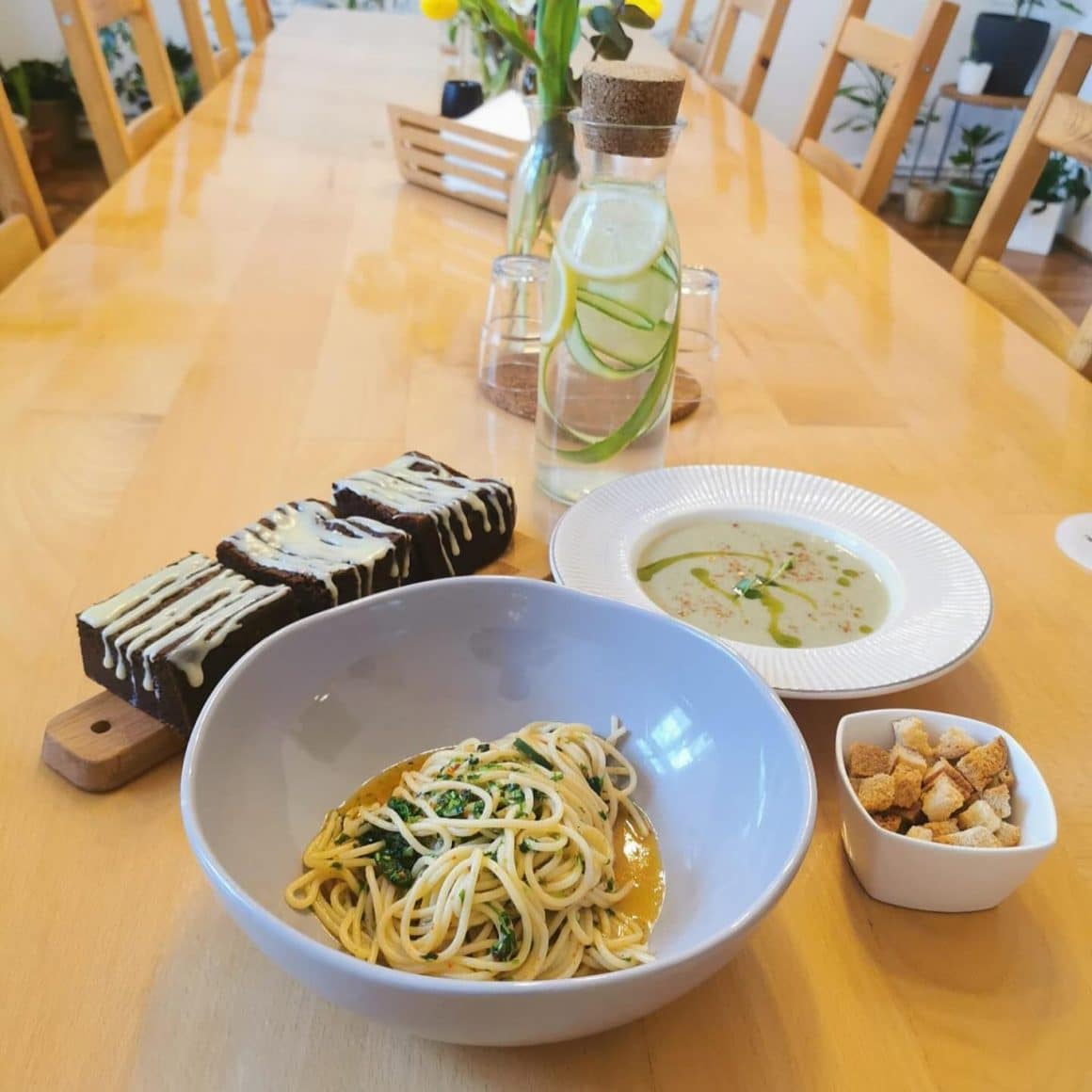 Poți, spre exemplu, să îți iei o shakshouka vegană, cu humus din linte și tofu. Ori hummus din linte, sau o supă de pleurotus care e ca o ciorbă de burtă „falsă”. Și să nu uităm de deliciosul Cheesy Vegan Burger.
