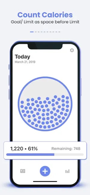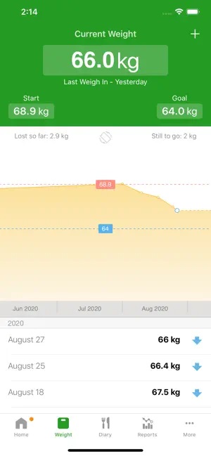 Pe pagina de start, afișează o diagramă cu bare care reprezintă procentul de calorii consumate și caloriile rămase în fiecare zi, calorii pe care aplicația le calculează atunci când îți stabilești obiectivele. Dar poți personaliza și manual ținta de calorii. În „istoric“ găsești o defalcare a alimentelor și a caloriilor consumate per masă, împreună cu grafice săptămânale, lunare și anuale ale aportului total de calorii și ale modificărilor de greutate.