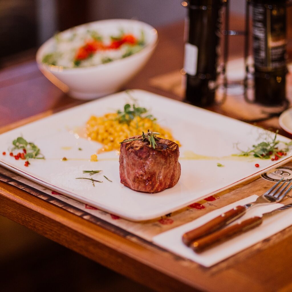 Denumirea spune tot – vorbim de un steakhouse, probabil cel mai bun din Sibiu. Benjamin Steakhouse e un restaurant cu specific american, ceea ce înseamnă că se pune mare accent pe fripturile de calitate. Folosesc legendara carne de vită Black Angus, maturată minim 21 de zile, provenite din vite crescute pe pășunile naturale din Transilvania. Și o prepară la un cuptor-grill Josper, cu cărbune de lemn (unic în Transilvania, după cum zic ei), care oferă o savoare deosebită fiecărui preparat. Avantajul acestui cuptor e că se poate găti repede, la 400 de grade, așa încât carnea capătă o aromă excelentă afumată, suculentă. Pe lângă steak-uri, au și salate, pește, paste, burgeri și deserturi delicioase. Preparate simple, dar foarte gustoase, ingrediente de calitate, gătite la perfecțiune, mâncare plină de aromă.