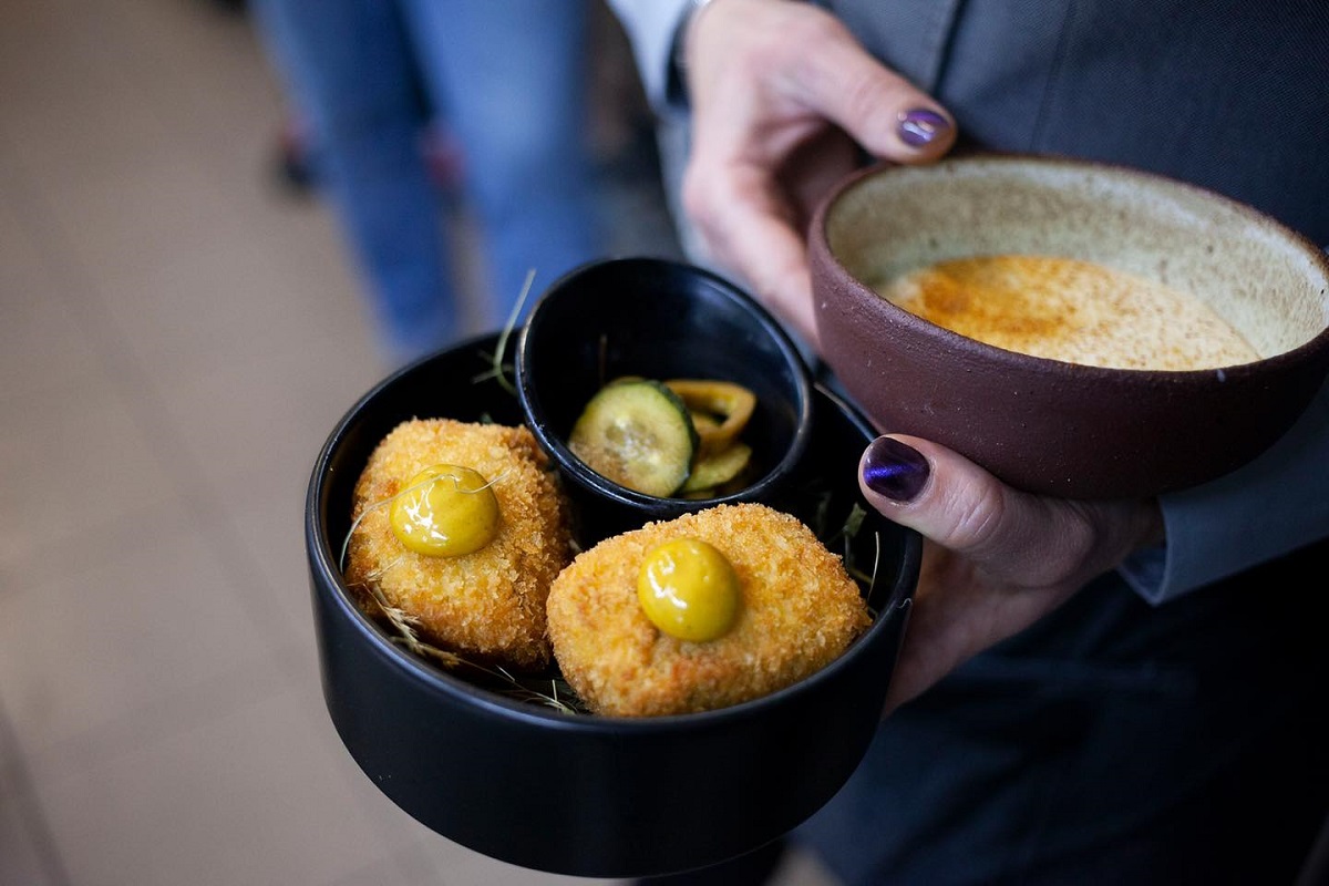 În meniu găsești preparate gen tapas delicioase, concepute pentru a fi împărțite și trimise la masă de îndată ce sunt finalizate – precum Gyoza de pui, Foie Gras Torchon, sau Pâinici Bao. Foarte bune sunt și preparatele de la main course (precum spaghetti cu sepie, ramen, sau Antricot de vită Wagyu A4). iar la desert îți rercomandăm să nu ratezi Sticky toffee pudding cu sos butterscotch și înghețată de vanilie.