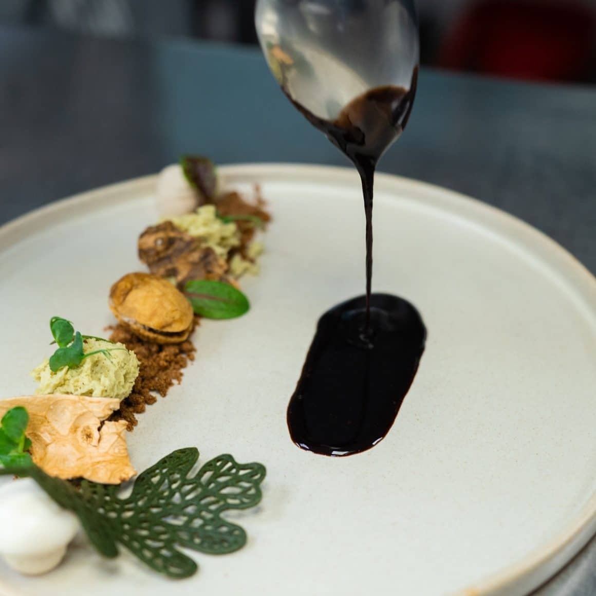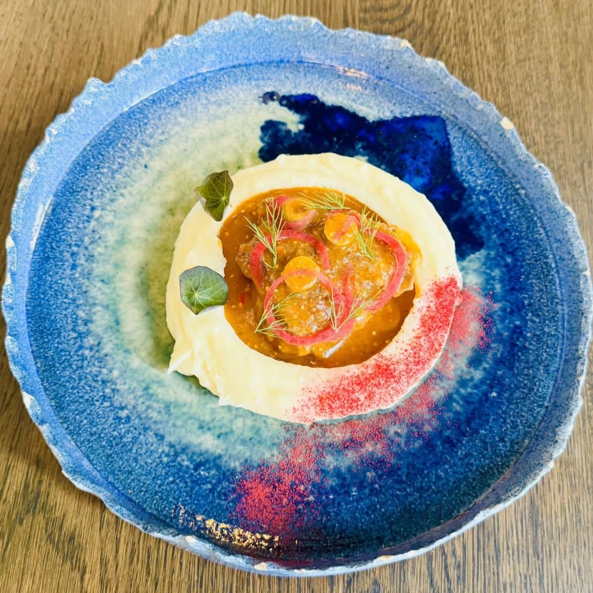 Un alt exemplu sunt gnocchi din cartofi mov și albi. Făcuți în casă, fiecare bucată e modelată manual – nu cu formă, nu cu tăietor, ci cu mâinile noastre. O zi întreagă pentru doar câteva porții. Totul pleacă de la proporția corectă între cele două tipuri de cartofi și se încheie cu o textură care nu poate fi obținută decât așa, încet. Sunt serviți cu un sos de șalotă caramelizată cu vin alb și mai apoi infuzat cu frunze de smochin, dovlecei sotați, alune prăjite și un ulei aromat din ierburi. Nimic extrem de complicat în aparență. Dar fiecare element cere timp și atenție.