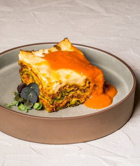 Și tot lasagna, dar în varianta cu ciuperc și spanac, găsești și la Samsara (cu sos ragu din ciuperci, spanac, sos bechamel, mozzarela și sos de roșii).