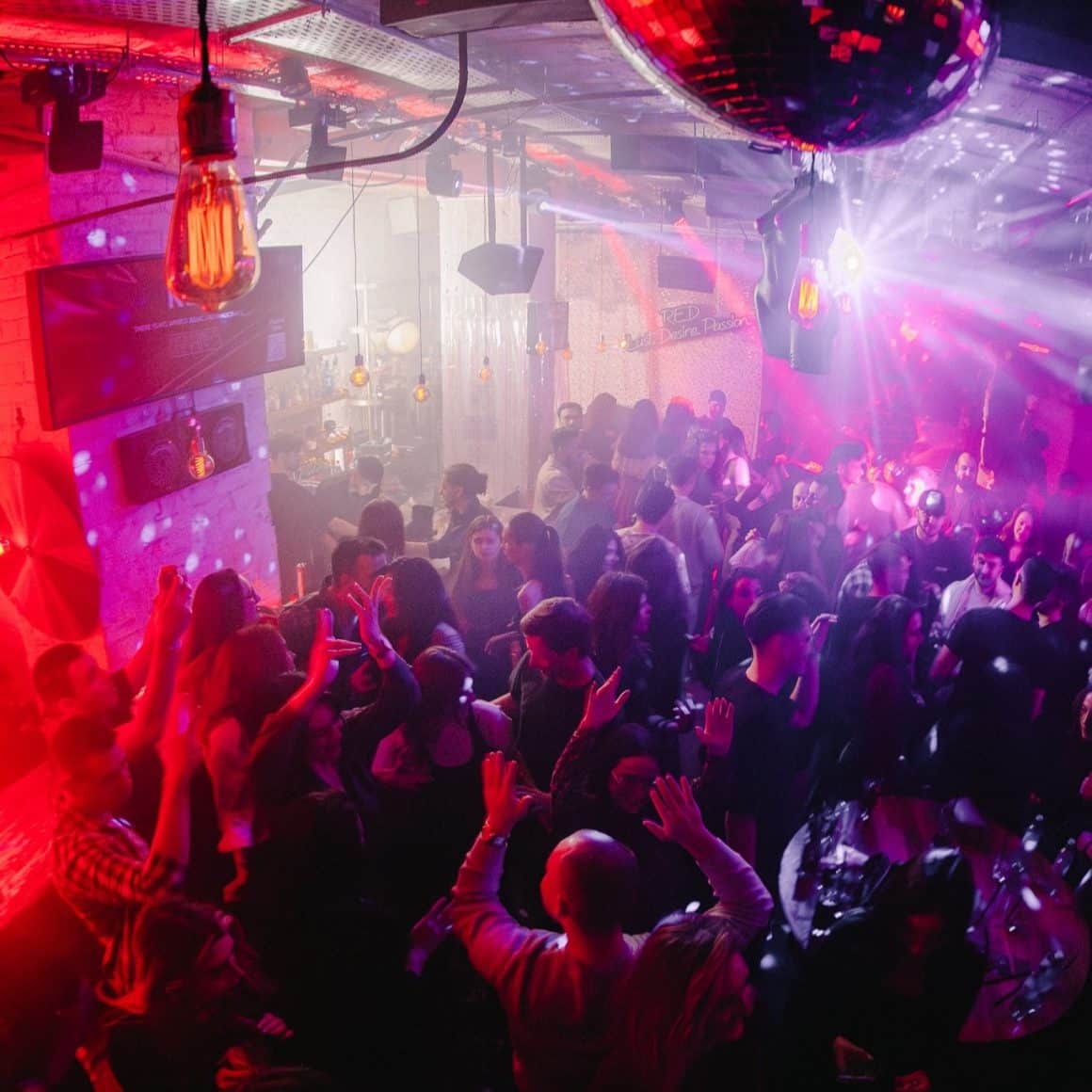 Mai multe fete danseaza la Interbelic Cocktail Bar. In lumina rosie. Restaurante pentru o ieșire cu fetele