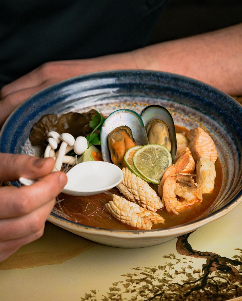 Știm că desertul e la urmă, dar să știi că printre deliciile localului se regăsește și o Pavlova reinterpretată asiatic, cu sos de mentă. Foarte bune și apreciate sunt și supele din meniul lor. Ca de exemplu Uminosachi no suimono, cu midii de Nouă Zeelandă, creveți, somon, lup de mare, paște de orez, rulouri cu varză și alge wakame. Și, în general, orice ai alege e preparat perfect – de la dumpling și tempura, paste, maki și sahimi, preparatele calde… tot! Ca să nu mai vorbim de aspectul estetic!