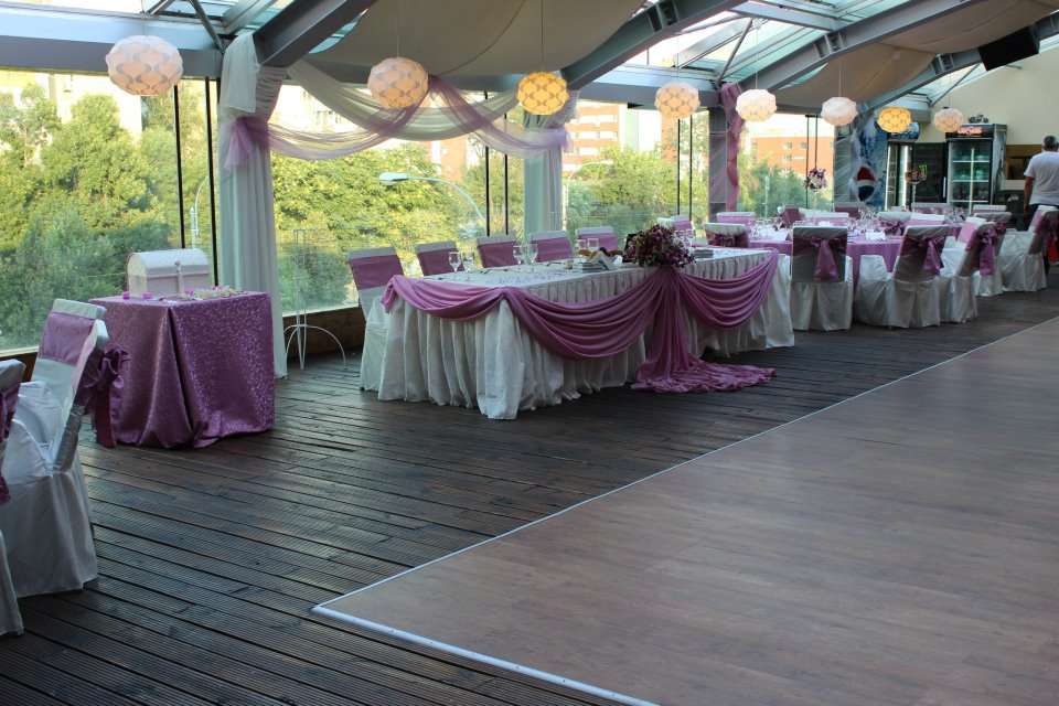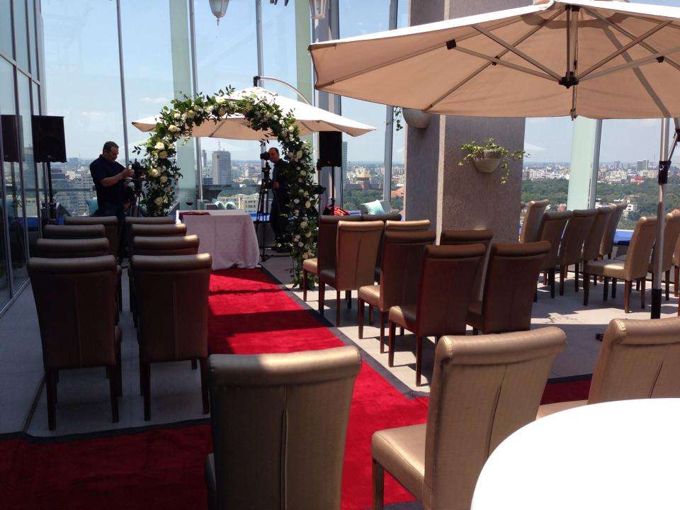 Si daca tot ne-am cocotat pe cladirirle Bucurestiului, sa va mai spunem de un restaurant la inaltime tocmai bun pentru organizarea nuntii: The Roof. Supranumit si restaurantul decapotabil, The Roof e ca intr-un glob de sticla, privelistea putand fi astfel admirata din orice punct al restaurantului. Pe timpul iernii, The Roof poate gazdui 120 de persoane, iar vara restaurantul are o capacitate de 350 de persoane, pe terasa. Meniurile pornesc de la 59 de euro si ajung la 79 de euro.