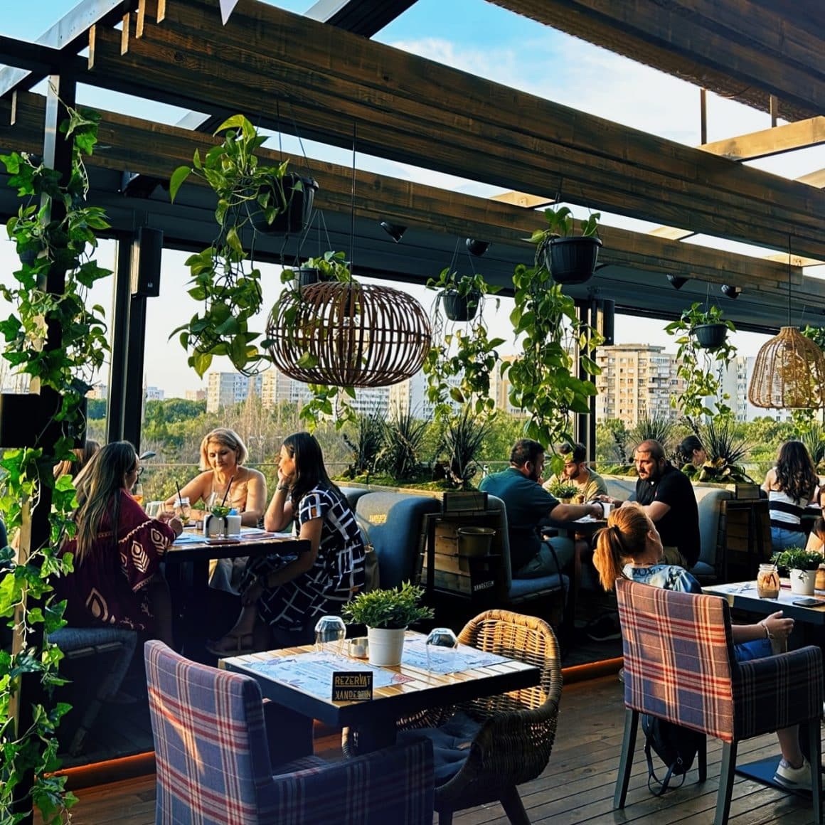 Spațiul e generos, luminat natural, cu un vibe modern-jungle și o terasă panoramică surprinzător de liniștită pentru zona în care se află. În meniu găsești preparate internaționale reinterpretate – de la burgeri serioși și salate proaspete, la paste și deserturi pe care le-ai comanda și fără copil de față.