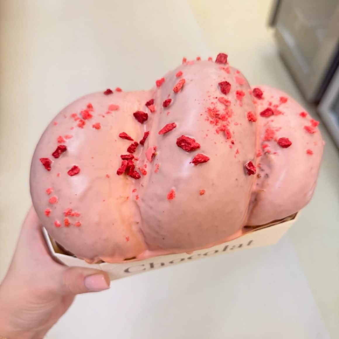 Iar de anul acesta, a apărut și cozonacul Lancôme x Café Chocolat în meniu. Cu aluat de cozonac, cremă de migdale cu zmeură și trandafir, glazurat în ciocolată și cu zmeură liofilizată.